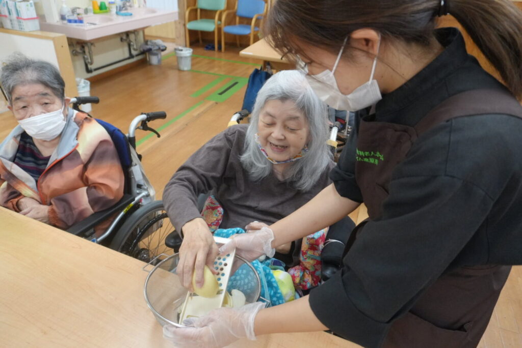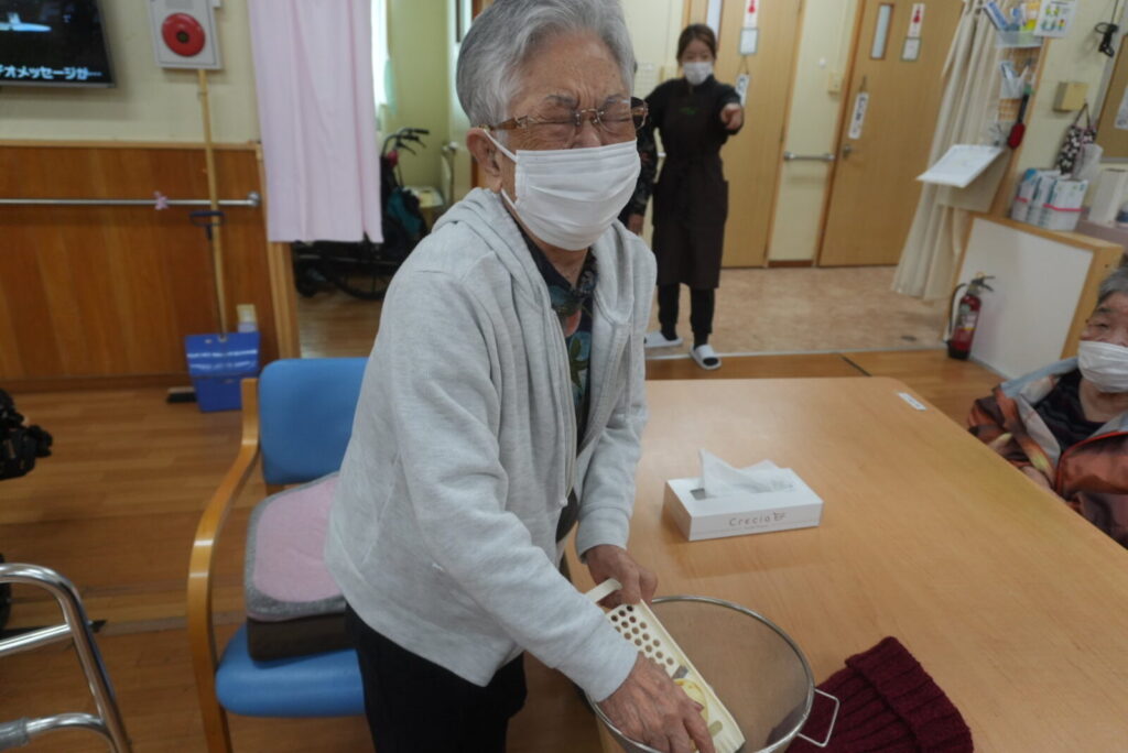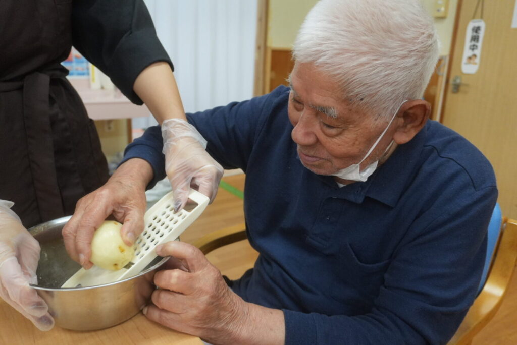 久しぶりのキッチン道具に最初は少し戸惑いも見られましたが、だんだんと感覚を取り戻し、9個分のじゃがいもをしっかり薄切りにできました。(揚げる工程はスタッフが担当しています)