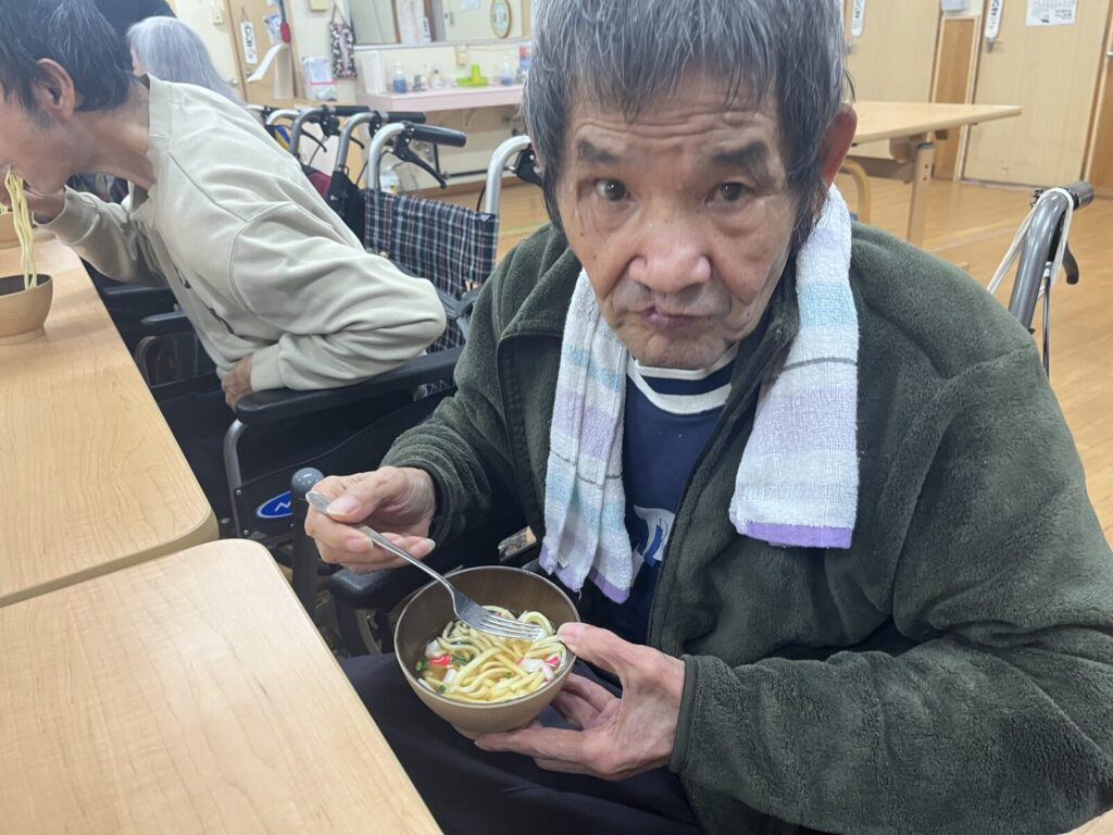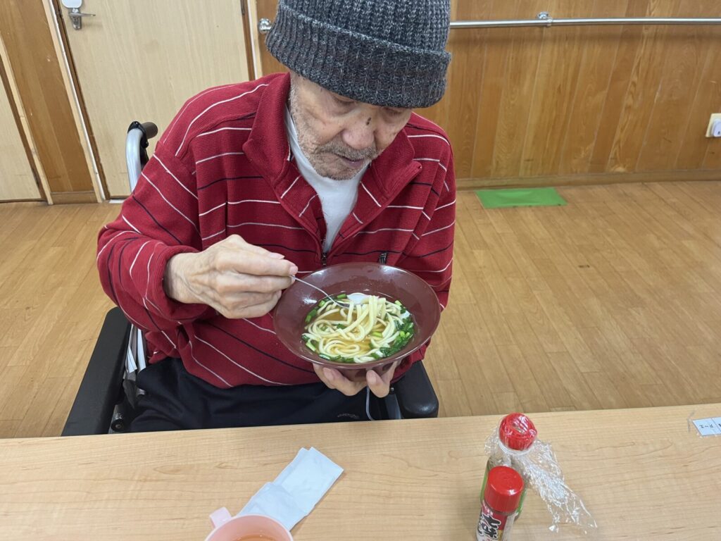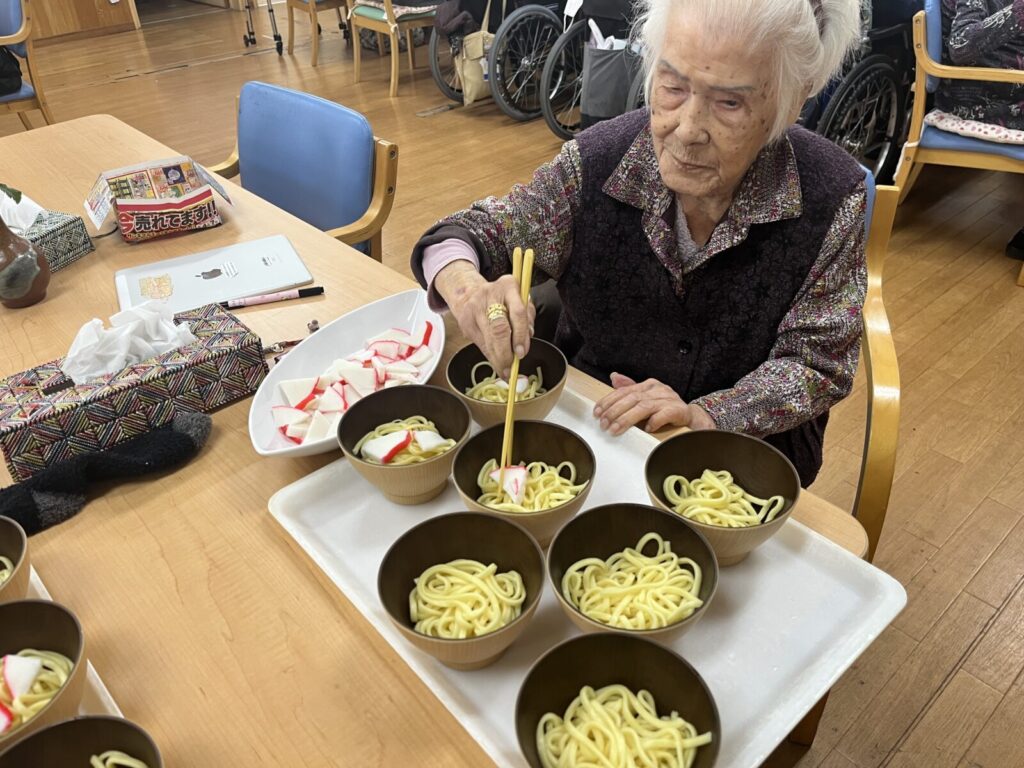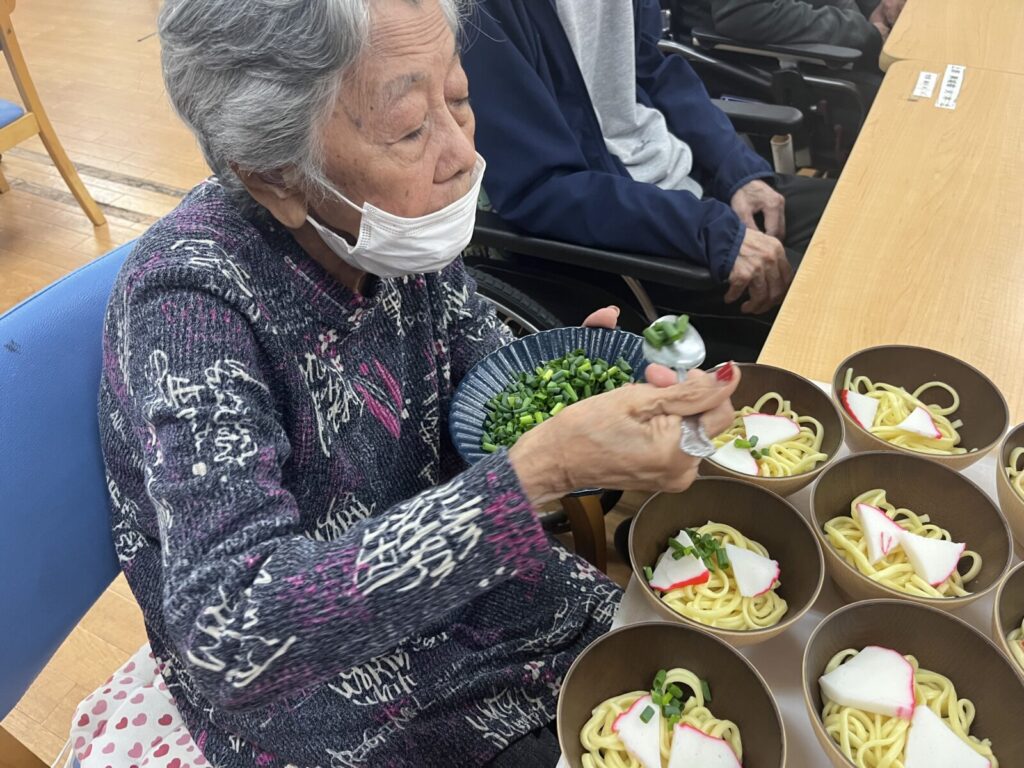 ネギやかまぼこのカット、そばの盛り付けなどを、利用者の皆さんで手分けしてお手伝いいただき、おやつの時間にいただきました。