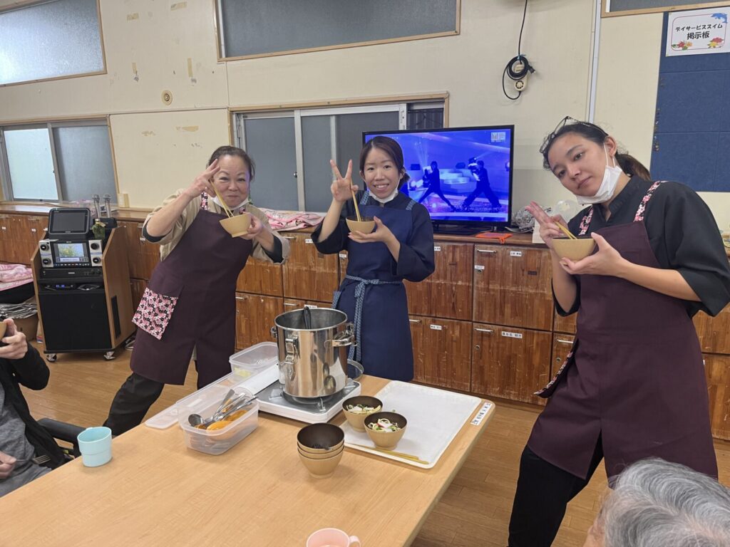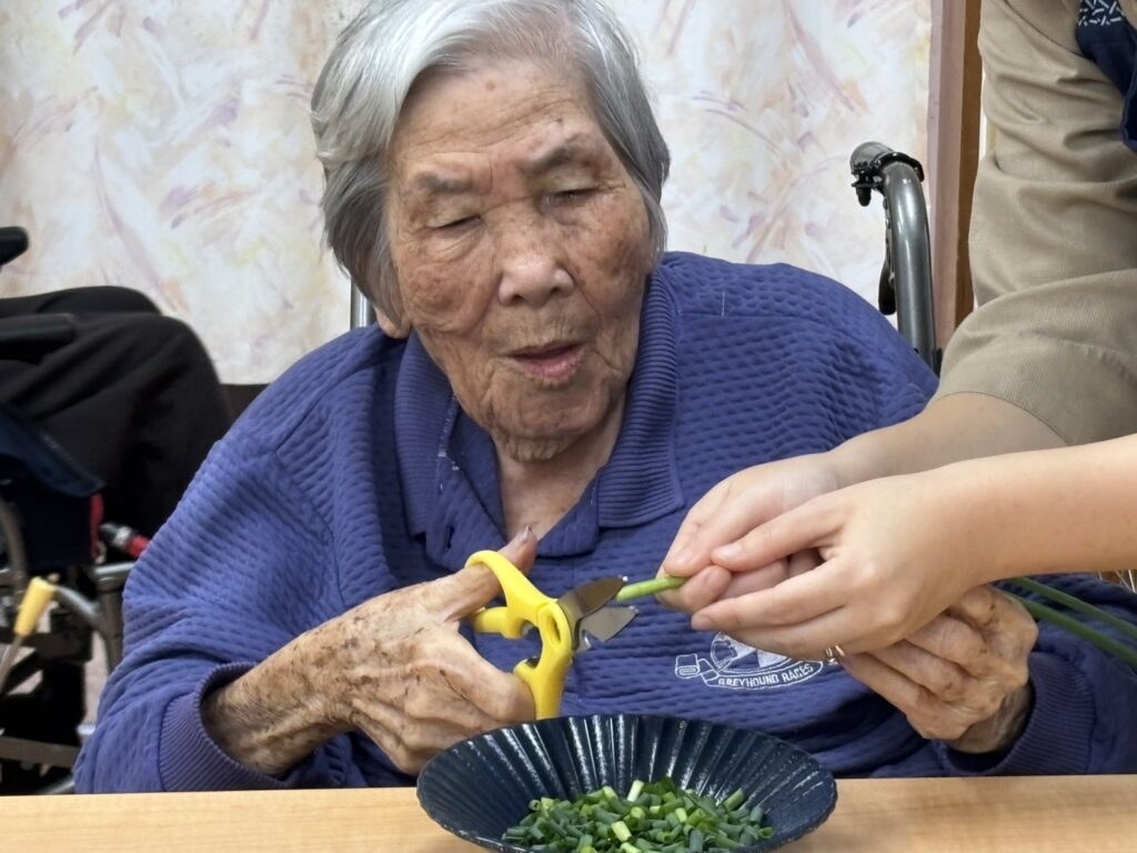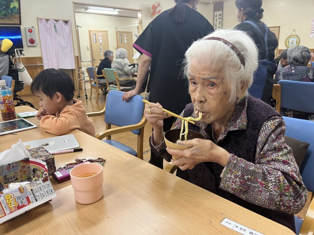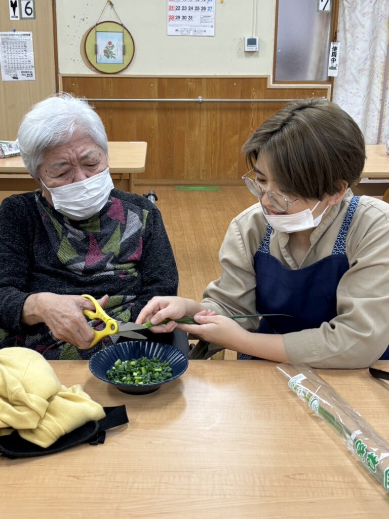 ネギやかまぼこのカット、そばの盛り付けなどを、利用者の皆さんで手分けしてお手伝いいただき、おやつの時間にいただきました。