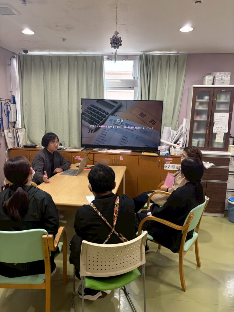 職員研修では、売上を増加させるためには営業や広報活動といった取り組みが必要であること、そして“正しい努力”を継続することで結果につながることについて学びました。